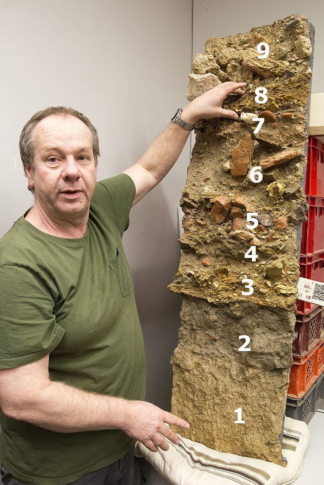 Der Laie sieht nur Steine und Geröll. Stadtarchäologe Andreas Schaub mit einem etwa einen Meter tiefen Schnitt, der im Jahre 2011 bei Grabungen unter der Vorhalle des Aachener Domes gesichert werden konnte. Der Schnitt zeigt mehr als 500 Jahre Aachener Siedlungsgeschichte, von unten nach oben (1) den gewachsenen Boden von der Jungsteinzeit bis zu den ersten Römern, (2) den "römischen Trampelhorizont", also die Ebene, auf der die ersten Öcher gelaufen sind. Schicht (3) ist der mit Feuerstein-Brocken durchsetzte erste römische Straßenbelag. Die Ebene (4) ist im Zusammenhang mit dem Bau der Münsterthermen entstanden. Sie enthält in großer Zahl Grauwacken-Splitter, die beim Behauen der Steine entstanden. In Schicht (5) finden sich jede Menge Ziegelabfälle. Die Grauwacken-Spuren in Schicht (6) lassen vermuten, dass zu dieser Zeit an den Thermen größere Umbauarbeiten, evtl. auch Erweiterungen, vorgenommen wurden. Ebene (7) enthält wiederum Bauschutt. Schicht (8) hat eine ähnliche Zusammensetzung wie (3). Seit dem Bau der ersten Straße (3) war soviel Siedlungsabfall liegengeblieben und neu bebaut worden, dass man das Niveau der Straße anheben musste. Schicht (9) schließlich enthält den Abbruchschutt der Münsterthermen, die Ende des vierten / Anfang des fünften Jahrhunderts aufgegeben wurden. An ihrer Stelle legte Karl der Große im Jahr 795 den Grundstein für seine Marienkirche, das Oktogon des Aachener Domes. (Wenn Sie das Bild ohne störende Zahlen betrachten wollen, fahren Sie einfach mit der Maus hinein. Für iPad-Nutzer: Fingertipp ins Bild lässt die Zahlen verschwinden, beim Fingertipp außerhalb sind sie wieder da.) // Foto: Ulrich Simons |